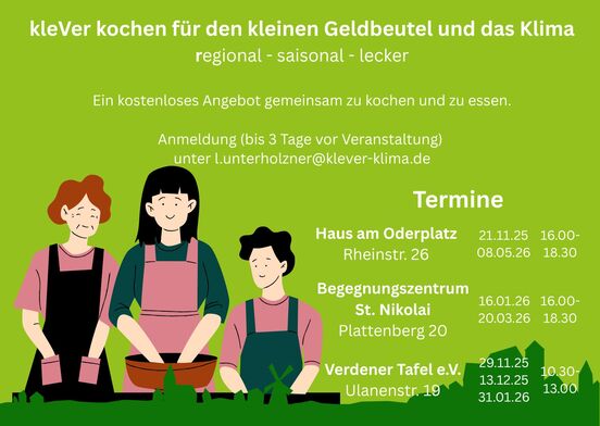 „Viele Menschen wollen selbst etwas tun, wenn es ums Klima oder andere große Themen geht“, sagt Lea Unterholzner, Koordinatorin des Projektes. „Bei Ernährung ist das leicht möglich, ohne, dass es teurer sein muss.“ Neben dem Aspekt des Klimaschutzes macht schlicht gemeinsames Kochen und Essen viel mehr Freude als allein zu sein. „Wir wollen mit “kleVer kochen” beides verbinden: Leckeres aus der Region in netter Gesellschaft zubereiten und essen.“ Alle sind herzlich eingeladen, das Angebot ist kostenfrei.