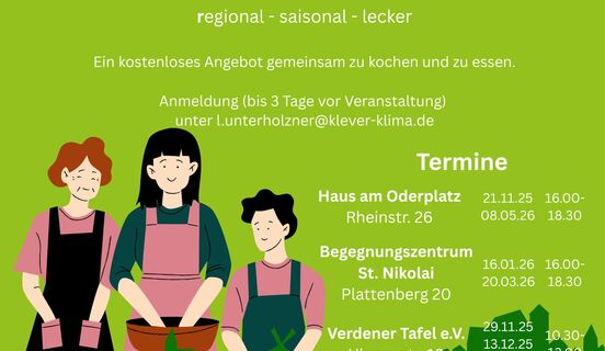 Am kommenden Freitag, 21.11. startet in Verden die Koch-Reihe „kleVer kochen“. Das Prin-zip ist einfach: gemeinsam mit 2 erfahrenen Köch:innen kochen die Teilnehmenden aus regi-onalen und saisonalen Zutaten ein leckeres Menü, das im Anschluss gemeinsam gegessen wird.